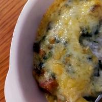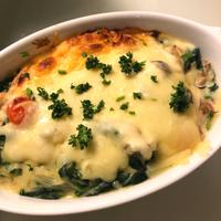 ミニトマトの爽やかな酸味がアクセントとなり、チーズの濃厚さと絶妙なバランスを生み出しています。マカロニや鶏肉、しめじなどお好みの具材をアレンジして楽しめます。トロトロのホワイトソースとほうれん草のコンビネーションが絶妙で、野菜たっぷりのヘルシーなグラタンに仕上がります。バケットを添えれば、ソースまで美味しく頂けるレシピです。
