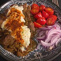 ギリシャの名物料理、ギロピタ風のご紹介です。スパイシーな豚肉にシャキシャキした紫玉ねぎとトマトを合わせ、ポテトフライも加えてボリューミーで、酸味の効いたソースが絶妙なおいしさです。トルティーヤ生地で包んで手軽に召し上がれますよ。ぜひお試しくださいね。