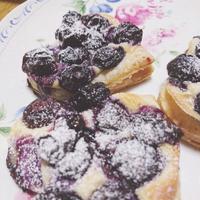 - 4 膨らんできたら2、1、ブルーベリー、グラニュー糖の順でのせ180℃のオーブンで15分再度焼いたら粗熱をとり完成です。