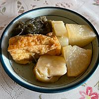 厚揚げと大根をおでん風に仕上げました。味が染みていてとてもおいしいですよ。素材の味を楽しめるお料理です。ほっとするお味ですので今晩の一品にいかがでしょうか。