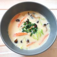 水100で野菜だけ火を通し、調製豆乳300を後から入れて味噌を溶きました。味噌は多め、すりごまプラスの濃口で。