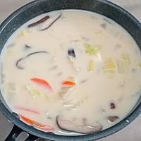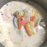 - 5 白菜が柔らかくなったら、無調整豆乳、顆粒和風だし、みそを入れます。みそを溶かしながら弱火で加熱します。