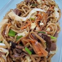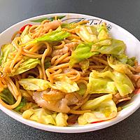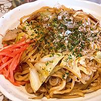 鰹節なし、細打ちの生茹で麺で作りました。出店の焼きそばみたいな味で美味しいです。