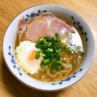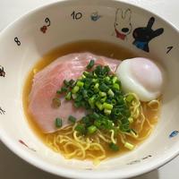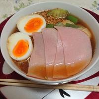 ラーメンのスープが優しい味で全部スープをいただきました!生ハムのかわりにふつうのハムが家にあったので。ゆで玉子はレンチングッズでスープを作りながら作ってプラスしました。