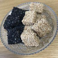 - 5 白いりごま、黒いりごまを半量ずつにまぶして完成です。