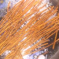 - 2 フライパンに揚げ油を用意し、180℃に熱します。 3種類のパスタを順番に、30秒から1分程度こんがりきつね色になるまで揚げます。