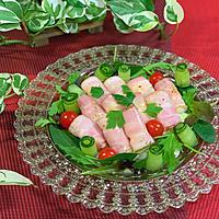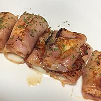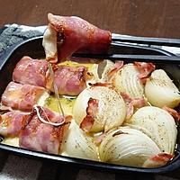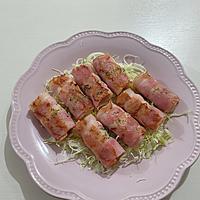 - 2 薄切りハーフベーコンで1を巻きます。