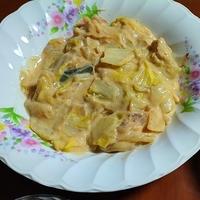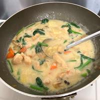 また、ルーは不使用、スゴイダイズ240gと粉チーズ31gで最弱火にしてとろみをつけた。
