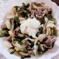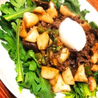 春菊とお肉のボリュームたっぷりのホットサラダです。温玉に絡ませるとご飯のおかずにもなります。春菊の茎は炒めることでくせが和らいで、食べやすくなりますよ。辛いものが好きな方は一味唐辛子などを加えるとおつまみにもぴったりです。お試しくださいね。