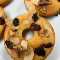 薄力粉を米粉に変えて、上にはミックスナッツとレーズををトッピングしました!