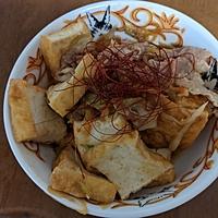 - 4 3へ2、1の厚揚げを加えて弱火にし、(A)を加え炒め合わせます。水分がなくなるくらいまで煮詰め、仕上げに糸唐辛子をのせて完成です。