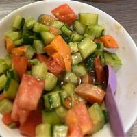 - 1 きゅうりとトマトはヘタを取り1cm角の角切りにします。紫玉ねぎは、粗みじん切りにします。