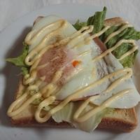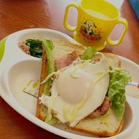 休日朝ごはんに作りました。パンはトースターで焼いて、バターをささっと塗り、その上にフリルレタスとベーコン、目玉焼きをのせました。