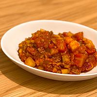- 4 ニンニクの香りが立ったら、1を入れて中火で炒め、全体に油が回ったら蓋をし中火で4分ほど加熱します。さつまいもがやわらかくなったら、牛豚合びき肉を入れ炒めます。