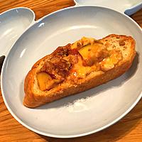 - 7 「窯焼きパスコ 国産小麦のバゲット」は6等分に切り、アルミホイルを敷いた天板にのせアルミホイルを被せます。オーブントースターで2分ほど皮がパリッとするまで温めます。バゲットに6をのせたら完成です。