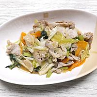 豚肉125g、野菜は青梗菜少量、玉ねぎ1/2個、ナス1本を使いました。どんな野菜でも合いそうな味付けでした。