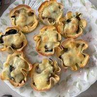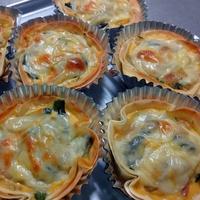 餃子の皮がパリパリの食感で食欲をそそる一品です。ベーコンやほうれん草を入れた定番の具材に加え、マッシュルームやシメジなどのきのこ類やアスパラ、かぼちゃなど、冷蔵庫の野菜でアレンジ可能。卵液にコンソメを加えることでコクのある味わいに仕上がります。オーブンやトースターで焼き目をつければ、お弁当やパーティーにもぴったりの見た目も可愛らしいミニキッシュの完成です。