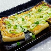 油揚げでねぎみそチーズ焼きのご紹介です。油揚げにみそベースのタレと長ねぎの青い部分、チーズをのせた簡単なおつまみメニューです。ごま油の香りが食欲をそそります。お好みで七味唐辛子をかけても美味しいですよ。