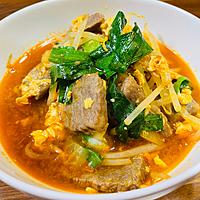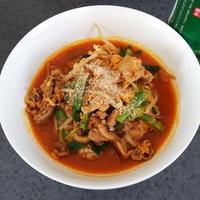 少し甘さがほしかったのでコチュジャン少なめで焼肉のたれを少々入れて自分好みにしました。スープが三人分の量です。お店の味です。美味しかった☺️😊😊😊😊