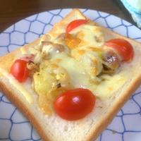 - 4 食パンに3、ピザ用チーズをのせます。アルミホイルを敷いた天板にのせ、オーブントースターでチーズが溶けるまで5分ほど焼きます。