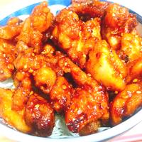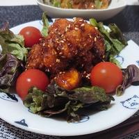 カリッと揚がった鶏もも肉に甘辛いタレが絡み、ご飯がどんどん進む一品です。タレはコチュジャンと七味唐辛子でピリッと辛みを効かせていますが、お好みで辛さを調整できます。衣がカリカリした食感を残しながらタレが絶妙に馴染むのが特徴。キャベツを添えたり、丼物にアレンジしたり、マヨネーズを添えても美味しく楽しめます。作り方も簡単で家族みんなに好評なメニューです。