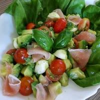 アボカドのイタリアンおつまみのご紹介です。イタリアンの定番食材、トマトやモッツァレラチーズ、バジルをアボカドと組み合わせた一品です。味つけはシンプルに塩こしょうのみですが、ニンニクの香りが効いているので、パンチのある味わいですよ。お酒のおつまみに、ぜひお試しくださいね。