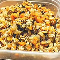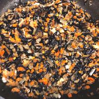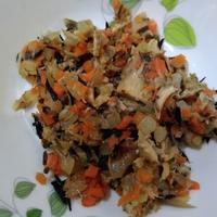 - 5 フライパンに中火でサラダ油を熱し、サバを炒めます。水気がなくなってきたら、野菜、干し椎茸、ひじきを加え、しんなりとするまで炒めます。