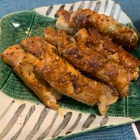 - 5 中火で熱したフライパンにオリーブオイルをひき、巻き終わりを下にして4を入れ豚ロースの色が変わるまで炒めます。