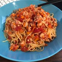 ボロネーゼソースとナス、ピーマン、パプリカでおかずになりました。