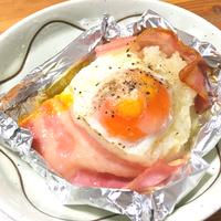 - 3 アルミホイルを敷いた天板に2をのせ、くぼみに卵をのせます。