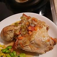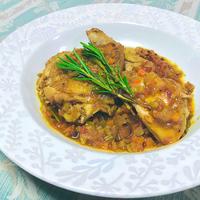 - 12 中火にかけて水、ローズマリー、赤ワインビネガーを入れ、落し蓋をして弱火で20分程煮こみます。骨付き鶏もも肉に火が通ったら骨付き鶏もも肉を取り出し、器に盛り付けます。