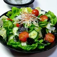 ごま油とにんにくがしっかり効いたドレッシングが決め手のサラダは、焼肉屋さんの味を完全再現!サンチュ、レタス、きゅうりに、白髪ねぎのシャキシャキ感がアクセントになっています。わかめや韓国のりを散らして食べると、より本格的な味わいに。むしゃむしゃ食べられる野菜たっぷりメニューとして、家族みんなに大好評です。