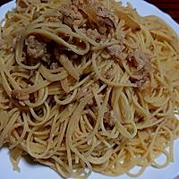 - 6 4のいぶりがっこの香りがオリーブオイルに移ったらツナ油漬けを加えて全体を混ぜながら弱火にかけます。5のスパゲティを軽く湯切りして加え全体をなじませます。