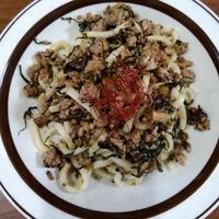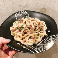 - 3 フライパンにごま油をひき、中火で牛豚合挽き肉と1を炒め、火が通ったら、うどんと2を入れて炒めます。