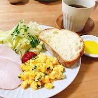 - 3 フライパンに有塩バターを入れて中火で熱して溶かし、2を入れます。木べらで大きくかき混ぜながら弱火で加熱し、半熟状になったら火から下ろします。