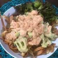海老のぷりぷり食感が大好評のレシピです。春巻きの皮を使うとパリパリとした食感が加わり、海老との食感の違いを楽しめます。練乳を入れたソースは甘さ控えめで、ブロッコリーとの相性抜群。生海老を使っても美味しく、春巻きの皮を春雨に変えても美味しく作れます。ブロッコリーの大量消費にも最適で、ソースを多めに作るとさらに美味しさアップ。カップサンドにしてもおいしくいただけます。