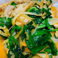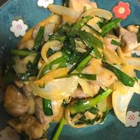 - 6 玉ねぎがしんなりしたら1、2のニラを加えて中火で炒めます。味がなじんだら火から下ろし、お皿に盛り付けて完成です。