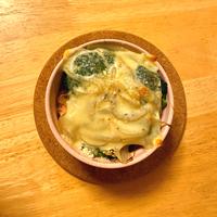 - 3 耐熱グラタン皿に1を並べて塩こしょうし、2をかけ、ピザ用チーズをかけてオーブントースターで5分 ほど表面がこんがりするまで焼きます。
