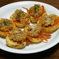 お使いのトースター機種によって焼き加減が異なりますので、様子を見ながらご調整ください。今回は1000W180℃で焼いています。 ひきわり納豆の付属のたれを使用する場合はめんつゆの量を調節してください。 今回がんもどきは油抜きせずに使用しました。気になる方は油抜きしてご使用ください。