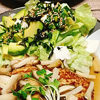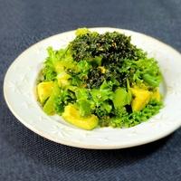 アボカドのクリーミーな食感と韓国海苔の香ばしさが絶妙なハーモニーを奏でる美味しいサラダです。ごま油の芳醇な香りとニンニクの風味がしっかりと効いた濃いめの味付けで、サニーレタスがシャキシャキと食感良く仕上がります。豆腐やトマト、キュウリなどをアレンジして楽しめ、みょうがをトッピングすれば彩りも華やかに。さっと作れる手軽さも魅力的です。