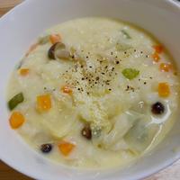 コーンスープの素を使って手軽に作ることができる、クリーミーな洋風の雑炊レシピです。めんつゆを入れることで、コーンスープ、牛乳、ごはんが、調和の取れた味に調います。ミックスベジタブルで彩りも鮮やかです。