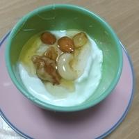 一晩たち、味がなじんだようです。ヨーグルトにかけて、上品なsweetsのできあがり。次はピスタチオも買ってきます。お家で、比較的安くできるのがいいです。