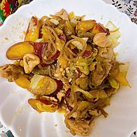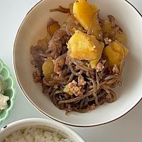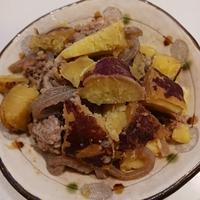 ほくほくとしておいしいさつまいもを、こんにゃくと、豚ひき肉と煮込みました。四角い状態に作られたこんにゃくを、こんにゃく突きで細長く加工された、つきこんにゃくを使用していますので、切る手間も省けますよ。