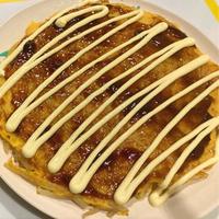 - 4 両面に焼き色がつき、火が通ったら火から下ろします。器に盛り付け、お好み焼きソースを塗り、マヨネーズ、青のりをかけて完成です。