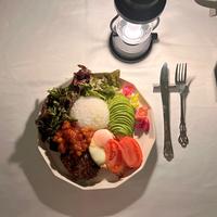 - 7 器にごはんをよそい、ベビーリーフを盛り付けて、4、6を乗せ、5をかけたら完成です。