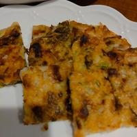 あとは子どもにウケるように、粉チーズを混ぜて、ピザチーズを表面に乗せてからひっくり返してカリカリに焼きました。