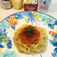 いくら70g、3倍濃縮のめんつゆ小さじ1✨パスタを、塩なしで茹でた為。もう一味欲しくて→ろく助の塩2つまみ、生クリーム大さじ3、追加‼️濃厚になり、美味しかったですが😅7歳娘、生クリームなしで、いつもの味でも大丈夫と笑