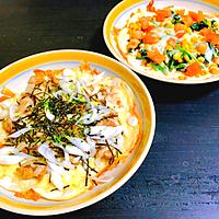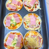 - 3 フライパンに餃子の皮を並べ、マヨネーズを薄く塗り2を乗せてチーズを散らします。