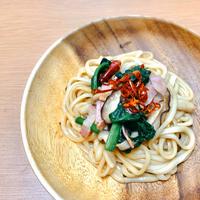 オリーブオイルの代わりにサラダ油でも、白ワインの代わりに料理酒でも結構です。 うどんは冷凍麺のほか、茹で麺、乾麺などお好きなタイプをお使いください。