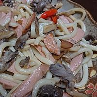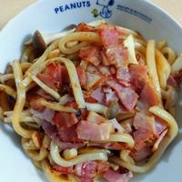 冷凍うどんを活用して、きのことベーコンも加えたペペロンチーノ風うどんです。パスタのペペロンチーノのように唐辛子とニンニクを効かせ、しょうゆで味付けしています。簡単にできるので、忙しい時の食事に是非作ってみてくださいね。